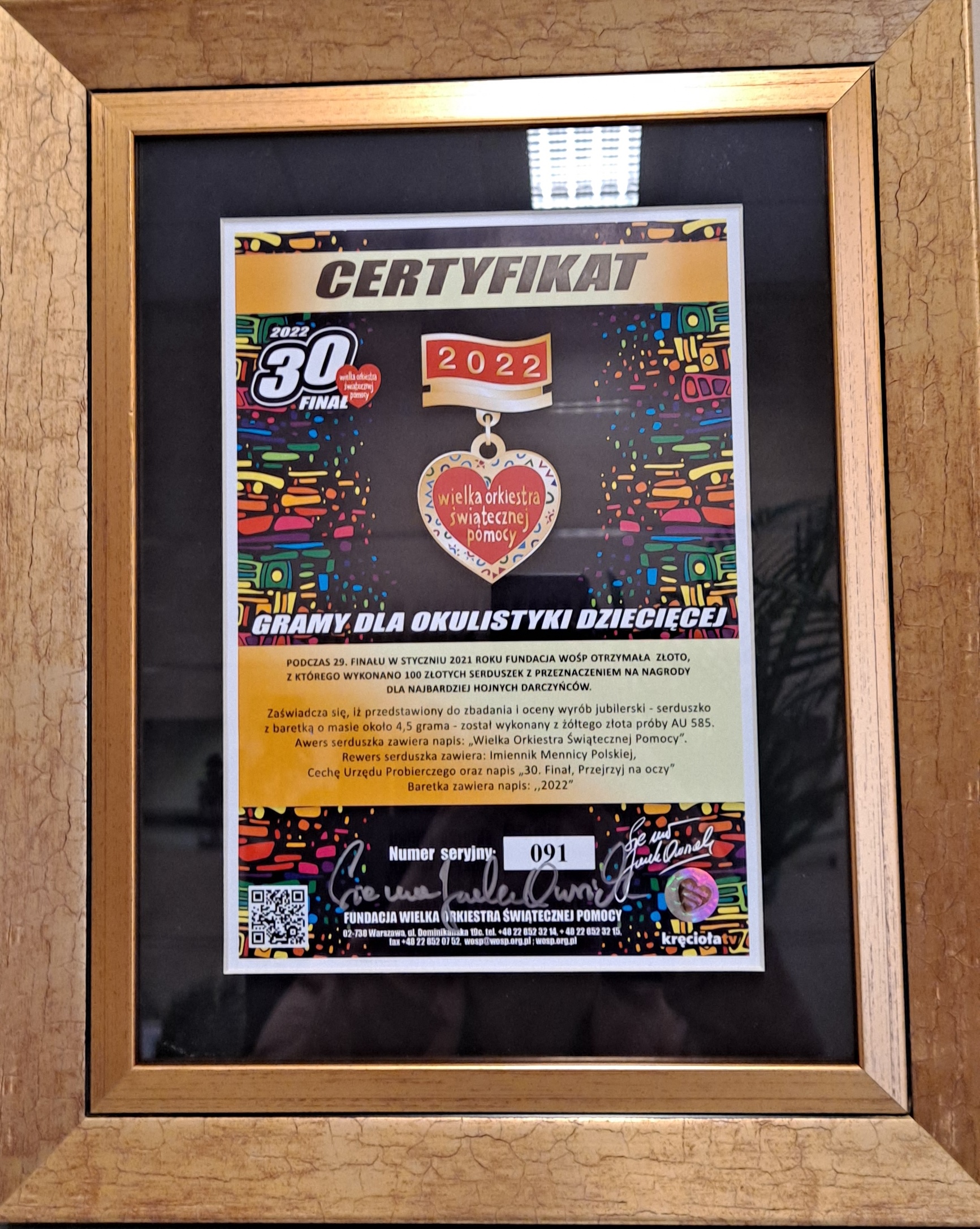 Podczas 30. Finału WOŚP w Koninie zostało uroczyście wręczone, zakupione przez Spółkę "Złote serduszko" za kwotę 10 000 zł, które odebrał Prezes Zarządu Henryk Drzewiecki wraz z reprezentacją pracowników. Pracownicy zakładu zbierali również pieniądze do puszki, przypomnijmy, że tegorocznym celem zbiórki było wsparcie okulistyki dziecięcej.