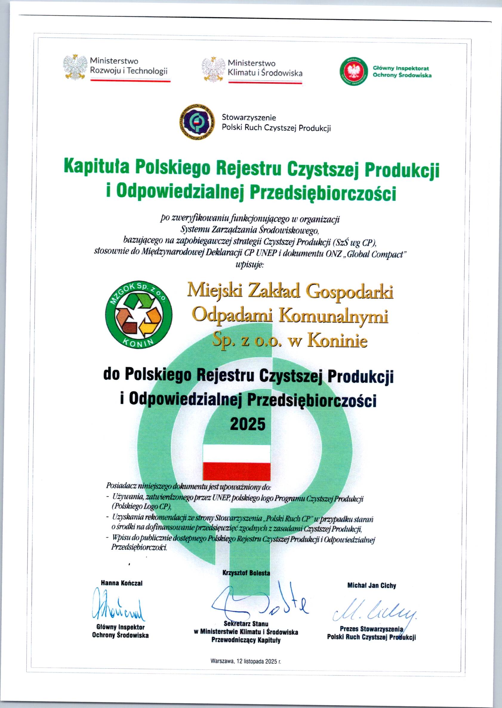 Miejski Zakład Gospodarki Odpadami Komunalnymi Sp. z o.o. w Koninie w Polskim Rejestrze Czystszej Produkcji i Odpowiedzialnej Przedsiębiorczości