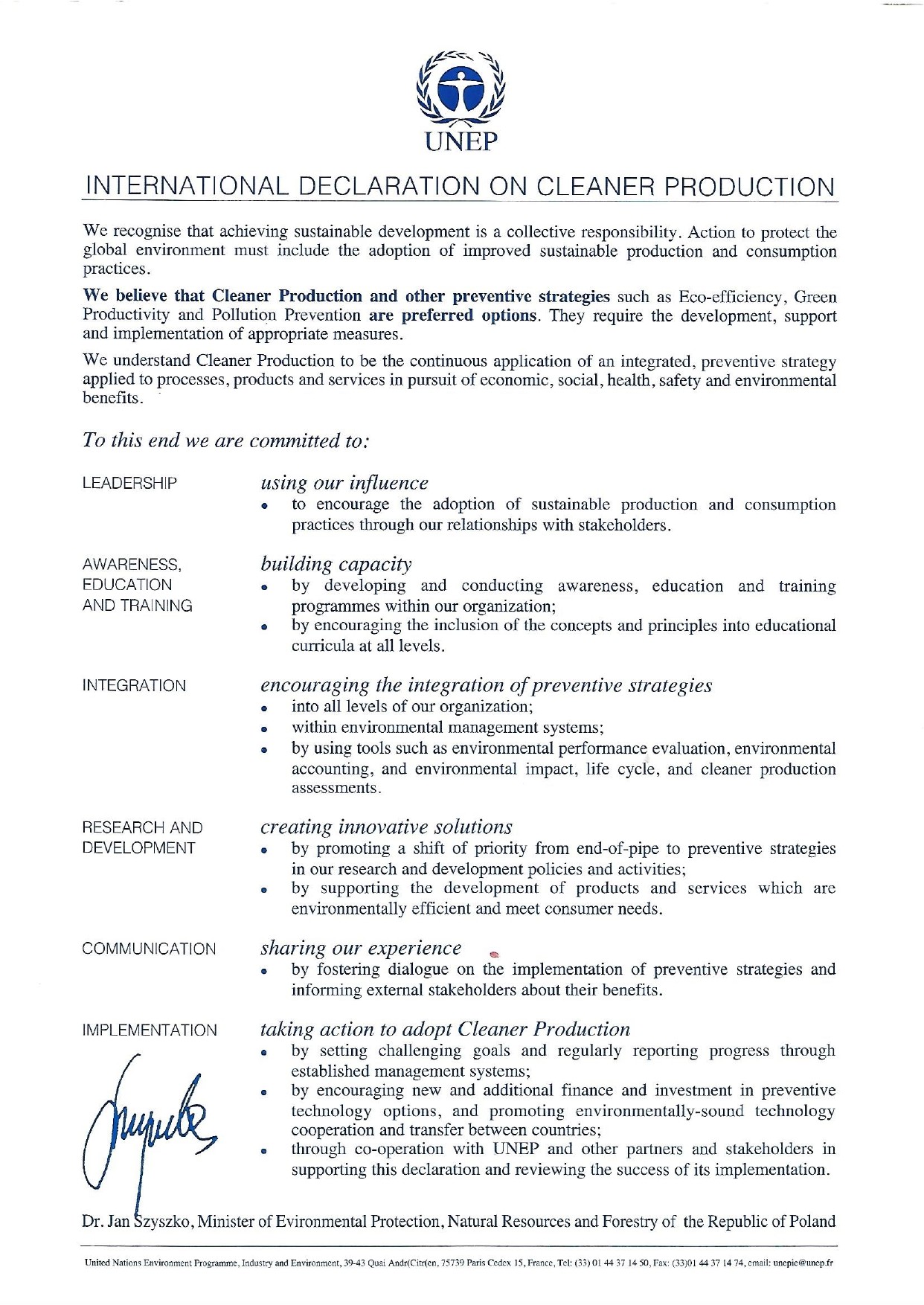 Podsumowując od dzisiaj Spółka staje się pełnoprawnym sygnatariuszem Międzynarodowej Deklaracji Czystszej Produkcji UNEP/ONZ.