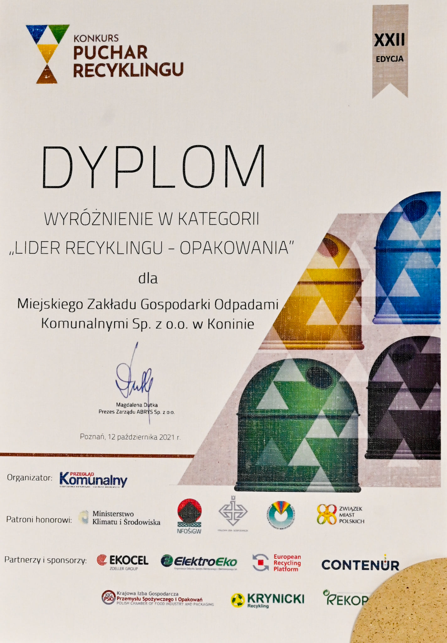 Podczas Międzynarodowego Kongresu Ochrony Środowiska nasza Spółka została wyróżniona w konkursie "Puchar Recyklingu" tytułem i statuetką "Aktywni w biznesie" oraz "Lider Recyklingu - Opakowania". Otrzymane wyróżnienia są jedynym w Polsce przedsięwzięciem, które w sposób kompleksowy ocenia selektywną zbiórkę odpadów i działania edukacyjne w tym zakresie. Prezes Zarządu Henryk Drzewiecki odebrał przyznane wyróżnienia podczas uroczystej Gali Międzynarodowego Kongresu Ochrony Środowiska ENVICON , która odbyła się 12 października br. w Poznaniu.